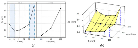 Table 11 shows the ANOVA results for the Ra parameter. The relationship of Ra as a function of the cutting length and cutting speed is presented in Equation (9).