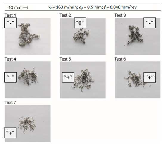 Photographs of chips for vc = 160 m/min (change of chip form), “-” = unacceptable chips with a length of more than 150 mm; “0” = acceptable chips with a length of 20–150 mm, and favorable chips “+” = with a length of up to 20 mm.