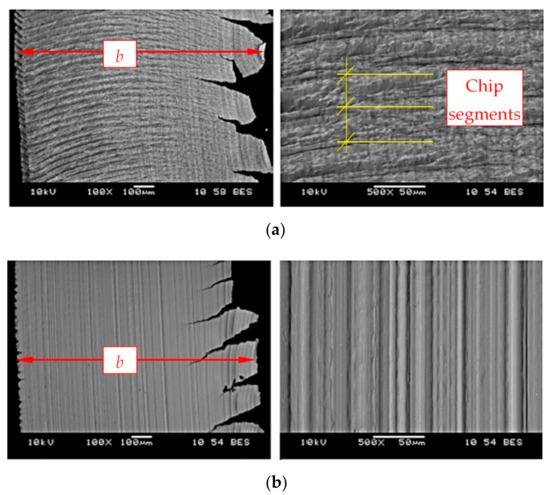 Microscopic images of the surface inside (a) and outside (b) of the chips; vc = 160 m/min, ap = 0.5 mm, b—chip width.