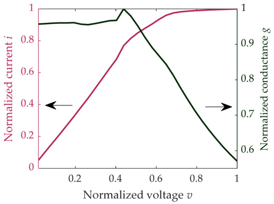 Left axes: typical normalized I-V characteristic obtained by averaging the currents of 5120 cells. Right axes: normalized cells mean conductance g = i/v.