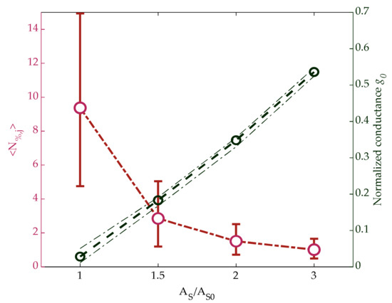 The ensemble average over all the tested cells is shown in Figure 5 (left) with red circles as a function of the amplitude AS, together with the indication of the 10% and 90% limits of the distribution. On the right vertical axis, the cell conductance averaged on both STOT = 188 time samples ti, and the 5120 measured cells are also shown, where the 10% and 90% limits of that distribution are depicted with dashed lines. The conductance was proportional to the SET amplitude, as expected, since a higher amplitude implies the crystallization of a wider cell volume. This leads to a reduction of noise, as its origin is mainly correlated to the lattice disordered structure of the amorphous phase [19,24,25].
