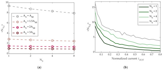 Finally, we explored the possibility to reduce noise through a time average operation. To this purpose, we repeated the previous measurements, and N% was calculated replacing in (3) each g(ti) with the average over NS consecutive samples equally separated in time by Δt = 5 min/NS, with NS = 1, 2, 4, or 8. Results are shown in Figure 7a, where a slight reduction of noise is visible, in particular in the AS0-SET case. In analogy with the AWC strategy, it is necessary to consider the additional power consumption introduced by the NS-oversampling operation. N% as a function of the normalized total current is shown in Figure 7b for the different values NS. It is seen that time average was not effective in terms of reducing noise for a given total current. This can be understood through taking into account the flicker nature of PCM cell noise [10,24,25,26], as time average operation is equivalent to a low-pass filter in the frequency domain.