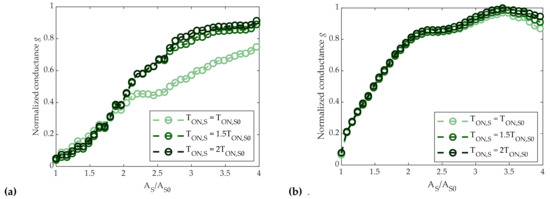 As before, the mean conductance of 5120 cells was monitored. Results are reported in Figure 11a,b for the SSP and SSC cases, respectively. In these cases, the conductance was not significantly influenced by the value of TON,S, except for the lowest value of TON,S in the SSP case. On the other hand, as opposed to the partial-RESET strategy, differences between the two sequences were indeed more visible—the SSC conductance tended to increase faster, reaching values above 90% of GMAX with a lower SET amplitude (AS = 2.2AS0), whereas the SSP conductance reached the same level only with a 3AS0–3.5AS0 SET pulse.