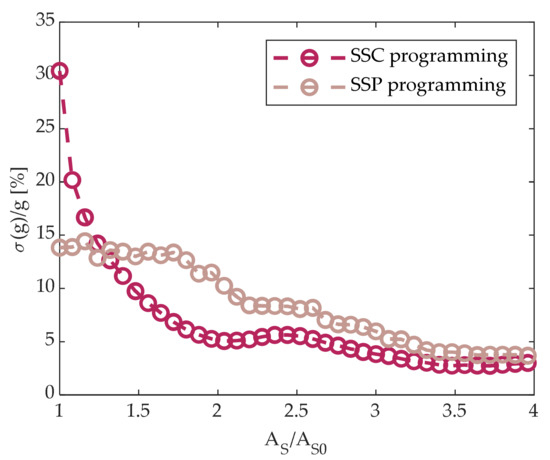 where the mean is calculated over the full set of NC = 5120 cells after the application of the AS,i-amplitude SET pulse. Results depicted in Figure 12 show that SSC programming led to a lower spread when AS > 1.4AS0, where TON,S = 1.5TON,S0. Additionally, SSP programming turned out to be more power-hungry, as it required a greater amount of RESET-applied pulses than the SSC programming to reach the same value of g.