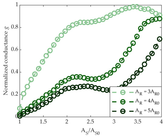 We finally investigated the effect of the amplitude of the start RESET pulse on the SSC programming curve. Results are shown in Figure 13, where g vs. AS/AS0 for TON,S = 1.5 TON,S0 is plotted for AR = 3AR0, 4AR0, or 5AR0. It is seen that the conductance tended to increase more slowly for larger AR. In turn, larger SET pulse amplitudes were required to reach the same conductance level when AR was larger. Therefore, the choice of the start RESET pulse amplitude played an important role in the programming curve; this property is exploited in the next paragraph.
