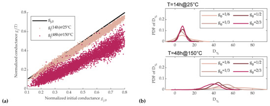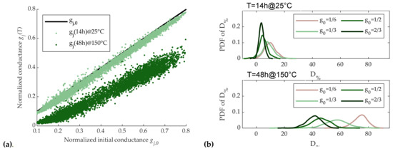 Figure 14a shows the values of the measured normalized cell conductances as a function of their initial normalized conductance g0 after the first and the second time intervals. Among the resulting conductivities, a set of four increasing normalized conductivity values (g0 = 1/6, 1/3, 1/2, 2/3) was chosen. Figure 14b reports the probability distribution function (PDF) of D% for such values of initial conductivity g0 ± 10%, where the top and the bottom plot refer to the first and the second measures, respectively. Results show that after 14 h, the mean value of D% was quite independent of initial conductance value g0, while its dispersion tended to decrease for higher values of g0. After 48-h bake, both the mean value and dispersion of D% were increased with respect to the first measure, and tended to decrease for higher values of g0, as can be observed also from Figure 14a.