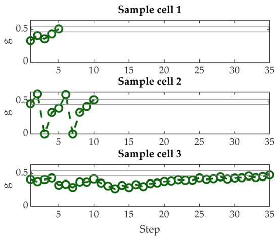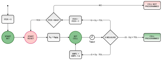 In this section, leveraging the characterizations described in the previous sections, we define an iterative programming algorithm, based on [23,24,25,26,27], aiming to set the cell conductance close to a desired value. The algorithm is outlined in Figure 16. Once the conductance target interval was defined, specifying the mean value and relative tolerance, the cell was first stimulated with the start SET and RESET pulses, as suggested by the results of the analysis discussed in the previous section. Then, the partial-SET SSC sequence (Figure 9d and Figure 11b) began with a minimum SET amplitude AMIN. After a predefined time, interval TWAIT, the cell current was read. If it fell within the target interval, the sequence was terminated. If the conductance was lower than the required limit, the cell was stimulated with a new SET pulse, with increased amplitude by a programmable step ΔA (see Figure 17, sample cells 1 and 3). If instead the conductance was above the upper limit, the whole process was restarted from the initial SET and RESET pulses (see Figure 17, sample cell 2). A maximum number of iterations ITERMAX was defined—if the algorithm exceeded ITERMAX, the cell would be declared not programmed and would not be used in the final AIMC array.