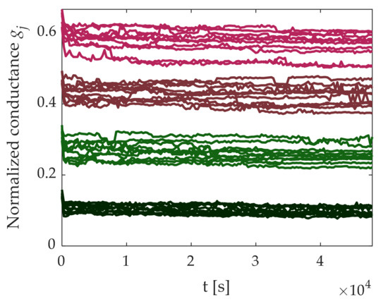 Then, the programmed cell conductance was monitored for ≈14 h (160 samples with 5-min steps), whose time evolution is depicted in Figure 18. It must be noticed that four different levels of conductance were distinguishable in the whole observation time interval. For each programmed group of NPC = 128 cells, we calculated the conductance spread defined as