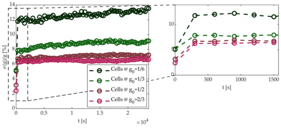 with results being reported in Figure 19. The initial value was under 6% in all cases (5.08%, 5.17%, 3.16%, and 2.42% for g0 = 1/6, 1/3, 1/2, and 2/3, respectively), lower than the target tolerance ± 10%. Then, due to the random conductance drift, GS% tended to increase in the first readout interval (5 min). After that time, spread did not change significantly, suggesting that the effect of drift was appreciable mostly in the first 5 min (or less). Moreover, cells with higher conductance showed a lower and less variable spread, consistent with the previous analysis (see Figure 15).