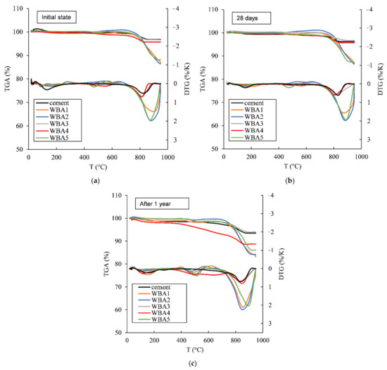 Thermogravimetric (TG) and differential thermogravimetry (DTG) curves of cement and wood biomass ash (WBA) samples for: (a) initial state; (b) 28 days, and (c) after 1 year (the data are available in Supplementary Materials).