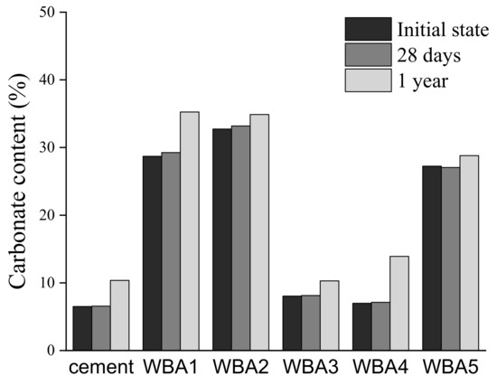 There were no significant changes in the TG and DTG curves after 28 days (Figure 3b), but after one year of aging in the closed containers, it is evident from the TGA (Figure 3c) that there is an increase in the amount of hydration products (first and second peak) and carbonation products (third peak). It is necessary to additionally highlight the results for the WBA4 sample after one year: There is an obvious mass loss over a wide temperature range, suggesting calcium silicate hydrate [21]. This could indicate that WBA4 sampling or storage conditions might have affected the moisture condition, although the seal has been checked in several time periods. Additionally, TG measurements were repeated for this sample, but the results were the same. In any case, apart from carbonation, the aging of WBA sample indicated hydraulic and/or pozzolanic reactivity. The chemical composition of WBA4 differs from other WBAs where higher pozzolanic oxides can be seen which could affect the aging process, but this needs to be confirmed by further research. Changes in carbonate content over time for each tested sample stored in closed containers, determined according to Equation (1), are shown in Figure 4. A large amount of carbonate phase is visible in all WBA samples, especially in WBA 1, WBA 2, and WBA5. It must be emphasised that when the carbonate content is high, as in these WBA samples, it is necessary to select the correct method for determining content of unburned carbon (UC), especially LOI testing, as one of the main characterization tools for supplementary cementitious materials (SCM) [44,45,46]. Generally, LOI values of WBA from Table 1 determine WBA as low-quality ash for application as mineral admixture if compared with requirements given by EN 450-1 [47]. Mineral additions with high content of UC can lead to increase water demand due to a high specific surface area [48].