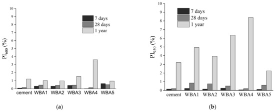 (a) PI600 value for WBA samples (7 days, 28 days, and 1 year) for temperatures between 35 and 600 °C; (b) PI950 value for WBA samples (7 days, 28 days, and 1 year) for temperatures between 35 and 950 °C.