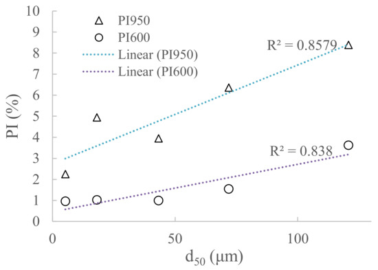 From Figure 5, it can be seen that WBA storage in closed containers for 28 days showed no increasing PI values, or no significant change in TGA results was observed for WBA aging for 28 days. PI600 values after 28 days were from 0.15% (WBA4) to 0.51% (WBA5), while for PI950 the values were from 0.21 (WBA4) to 0.85% (WBA1). However, after one year, there was a slight increase in mass loss between 35 and 600 °C and a more significant increase in mass loss between 35 and 950 °C, suggesting that carbonation of WBA samples stored in closed containers is more pronounced during aging. Here, sample WBA4 stands out as it shows the largest mass increase of all the samples studied from the time of collection (initial state) until storage in the closed container after one year. For sample WBA4, the values for indices PI600 and PI950 were 3.62% and 8.39%, respectively. Sample WBA3 had the second highest mass increase during aging (PI600 and PI950 were 1.54% and 6.36%, respectively), while sample WBA5 had the lowest mass increase (0.96% and 2.25%). Both samples with the highest increase in carbonation products (WBA4 and WBA3) were from power plants using grate combustion technology (with higher combustion temperature), implying that aging could have a greater impact on the WBA generated from this technology, as it promotes the complete decomposition of carbonates (CaCO3 and dolomite stones) into the free lime (and periclase). The influence of each chemical and physical property of the WBA on the increase in carbonation products was statistically analysed and the only parameter that had a statistically significant influence was particle size (Figure 6). Samples with larger particle sizes exhibited faster carbonation. A similar trend can be seen in the study of [28] where WBA samples with larger particles size from grate combustion showed higher mass increase when stored outdoors compared to other samples. The possible influence of combustion technology on the carbonation process of WBA samples should be further investigated.