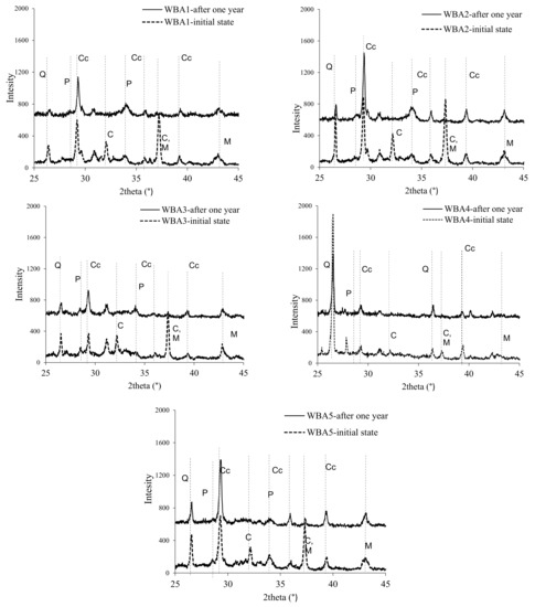 The results of XRD analysis of the tested WBA samples are shown in Figure 7 where the main phases were identified as follows: Cc—calcium carbonate (CaCO3), Q—quartz (Si2O), C—calcium oxide (CaO), M—periclase (MgO), and P—portlandite (Ca(OH)2). Comparing the diffractograms of the initial samples and those after one year of storage in closed containers, a strong decrease in the peaks of calcium oxide (lime) and magnesium oxide (periclase) can be seen. Therefore, some decrease in the amount of free CaO in closed containers can be expected. Materials with a high amount of free MgO and free CaO in concrete increase the risk of volume instability (swelling) during the hydration process, and the formation of cracks [49,50,51]. According to Table 1, the collected WBA have higher free CaO values compared to cement, but the soundness test results [36] showed that cement paste mixes with 15% WBA as cement replacement met the requirement of the standard EN 450-1 [47]. Free CaO is very sensitive to atmospheric moisture and carbon dioxide [52,53,54], leading to phase changes within the material [28,55,56]. The present results suggest when WBA is stored in closed containers, the free lime is stabilised over time, i.e., its reaction with water and CO2 is significantly delayed due to their limited availability by mass transport. This form of stabilization could be positive, as a decrease in free lime leads to a lower risk of volume instability when higher dosages of WBA are used as a cement replacement.