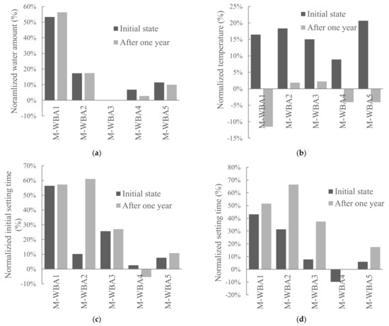 In order to evaluate the effect of aging in closed containers on the properties of cement pastes, setting time, standard consistency as well as cement paste temperature were tested with WBA delivered and with WBA stored in closed container for one year. Figure 8 shows the results of the standard consistency, setting time, and temperature of the pastes with 15% WBA as cement replacement (M-WBAi). WBA was used after collection from power plants (initial state) and after one year of aging, stored in closed containers (after one year). All results were normalized with respect to the reference mix.