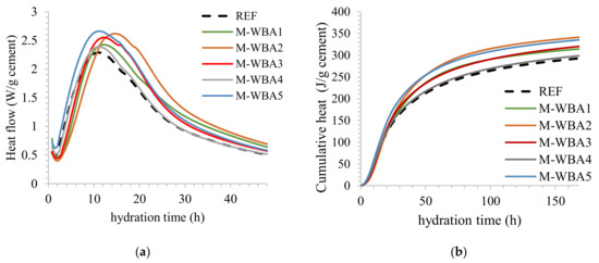 The influence of WBA after 1 year on the reactivity of pastes: (a) heat flow; (b) cumulative heat flow (the data are available in Supplementary Materials).