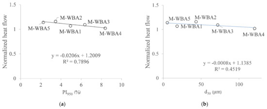 (a) Normalized cumulative heat flow after 168 h and PI950 values after one year of storage of WBA samples; (b) normalized cumulative heat flow after 168 h and d50 of WBA samples.