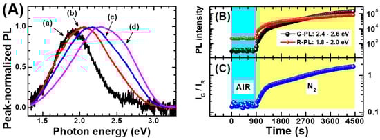 5.3. Interplay between Photogenerated Charges and Molecular O2 Adsorption: The O2-Dependent PL