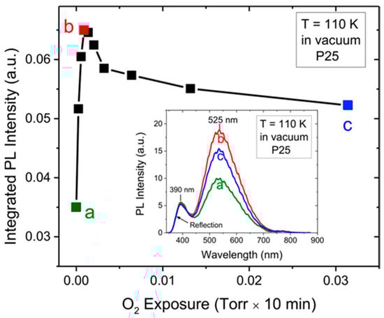 - The overall anatase PL (i.e., both their spectral contribution) are subject to intensity quenching when the surface is exposed to O2. However, the “green” contribution is more sensitive than the “red”.
