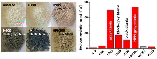 - Liu, N.; Zhou, X.; Nguyen, N.T.; Peters, K.; Zoller, F.; Hwang, I.; Schneider, C.; Miehlich, M.E.; Freitag, D.; Meyer, K.; et al. Black Magic in Gray Titania: Noble-Metal-Free Photocatalytic H2 Evolution from Hydrogenated Anatase. ChemSusChem 2017, 10, 62–67. [Google Scholar] [CrossRef] [PubMed]