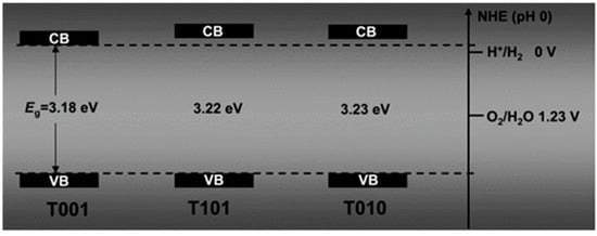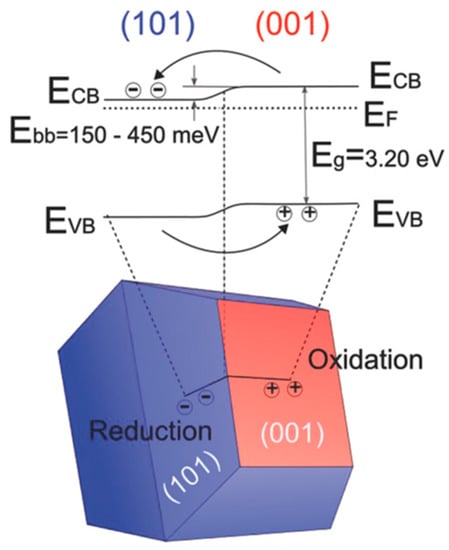 - Kashiwaya, S.; Toupance, T.; Klein, A.; Jaegermann, W. Fermi Level Positions and Induced Band Bending at Single Crystalline Anatase (101) and (001) Surfaces: Origin of the Enhanced Photocatalytic Activity of Facet Engineered Crystals. Adv. Energy Mater. 2018, 8, 1802195. [Google Scholar] [CrossRef]