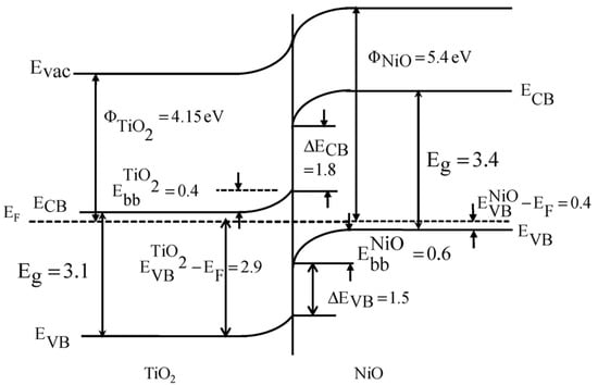 - Uddin, M.T.; Nicolas, Y.; Olivier, C.; Jaegermann, W.; Rockstroh, N.; Junge, H.; Toupance, T. Band Alignment Investigations of Heterostructure NiO/TiO2 Nanomaterials Used as Efficient Heterojunction Earth-Abundant Metal Oxide Photocatalysts for Hydrogen Production. Phys. Chem. Chem. Phys. 2017, 19, 19279–19288. [Google Scholar] [CrossRef]
