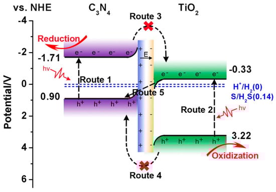 - Wei, S.; Wang, F.; Yan, P.; Dan, M.; Cen, W.; Yu, S.; Zhou, Y. Interfacial Coupling Promoting Hydrogen Sulfide Splitting on the Staggered Type II G-C3N4/r-TiO2 Heterojunction. J. Catal. 2019, 377, 122–132. [Google Scholar] [CrossRef]