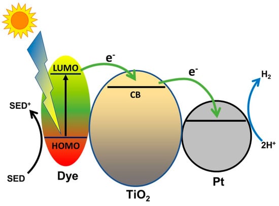- Huang, J.; Lei, Y.; Luo, T.; Liu, J. Photocatalytic H 2 Production from Water by Metal-free Dye-sensitized TiO2 Semiconductors: The Role and Development Process of Organic Sensitizers. ChemSusChem 2020, 13, 5863–5895. [Google Scholar] [CrossRef] [PubMed]