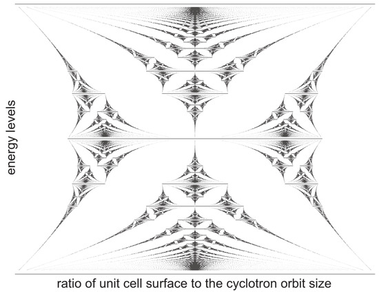 Rendering of Hofstadter butterfly—a fine structure of LLs for the single electron in the periodic square type 2D external potential is shown as the function of the commensurability factor of the cyclotron orbit size with the unit crystal cell. The energy levels are indicated versus the magnetic field flux through the elementary cell, , expressed in units of the elementary flux , i.e., versus the ratio of the unit cell surface to the electron cyclotron orbit size [19,20].
