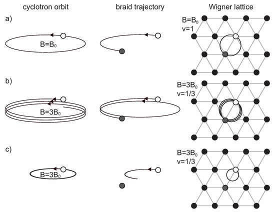 To define the braids , the appropriate positions of the electrons in the Wigner lattice must be accessible, so that these electrons can exchange according to these braids. It is clear that such electrons must be separated in consistence with the metrics of these braids and, on the other hand, in consistence with the electron distribution in the Wigner lattice, in order to allow exchanges. The metrics of is larger than that of (if are precluded) and perfectly fits to separation of electrons at the magnetic field , at which the metrics of is too small, i.e., (for ), but . In such -times larger fields, the generators cannot be defined and must be removed from the full braid group and substituted by new generators with larger metrics (as illustrated in Figure 2b). The new generators generate a subgroup of the full braid group (as expressed by ) and we call this subgroup the cyclotron braid subgroup [17,28]. Again, the condition of the equality of the generator metrics with the closest particle separation (expressed as the surface per particle, with S and N kept constant) defines the homotopy invariant,