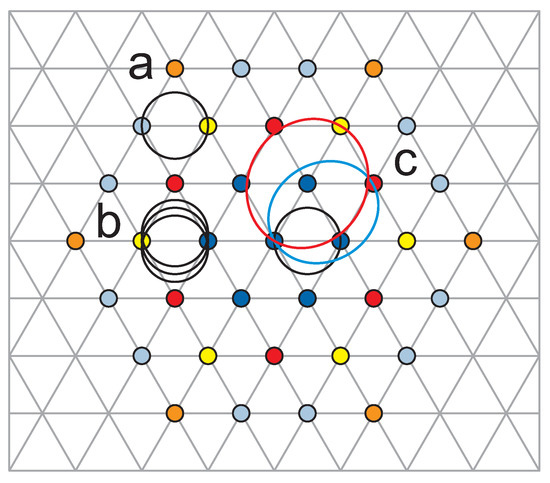 Schematic presentation of exemplary commensurability patterns acc. to Equation (9) for single-loop cyclotron orbit and (a), three-loop cyclotron orbit with all loops nested with nearest neighboring electrons and , i.e., , in Equation (9) (b) and three-loop cyclotron orbit with loops nested with next-nearest electrons, i.e., for , and , in Equation (9), for which (cf. Figure A2 for the explanation of values for displaying fractions of succeeding generations of next-nearest neighbors in the Wigner lattice) (c).