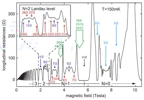 - Pan, W.; Störmer, H.L.; Tsui, D.C.; Pfeiffer, L.N.; Baldwin, K.W.; West, K.W. Fractional quantum Hall effect of composite fermions. Phys. Rev. Lett. 2003, 90, 016801. [Google Scholar] [CrossRef] [PubMed]