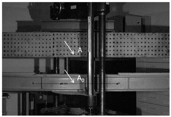 Measurement points for observation and recording of displacements were marked on the front surface of the beams. In order to determine the deflection, the displacement of the point at the place of the expected maximum beam displacement (at the lowermost measurement point in the symmetry axis) was analyzed in relation to the reference point on the steel base of the beam supports, Figure 4.