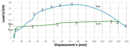 Displacement of the measuring point A in the midspan of beams Series 1 with the proposed truss reinforcement T-s1 and with conventional reinforcement C-s1.