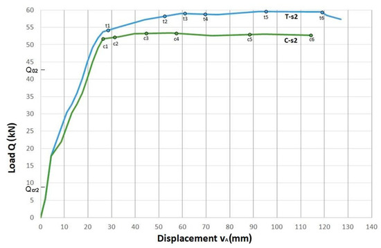 Displacement of the measuring point A in the midspan of beams Series 2 with the proposed truss reinforcement T-s2 and with conventional reinforcement C-s2.