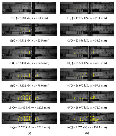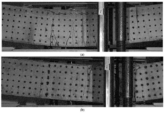 The non-contact optical method was used in the study to determine with sufficient accuracy for the displacement measurement to build a displacement curve as a load function. However, such accuracy was not sufficient for measuring the crack width. Therefore, only the crack pattern with visualization of the cracks’ range at the cross-section height could be presented.