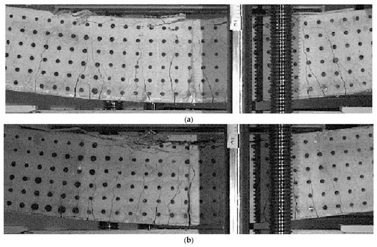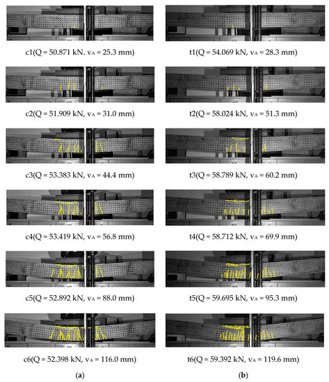 The cracking and failure mechanism of beams with a new truss-shaped reinforcement system was also analyzed. The images of the crack pattern are presented without measuring the crack width, but with visualization of the cracks’ range at the height of the cross-section.