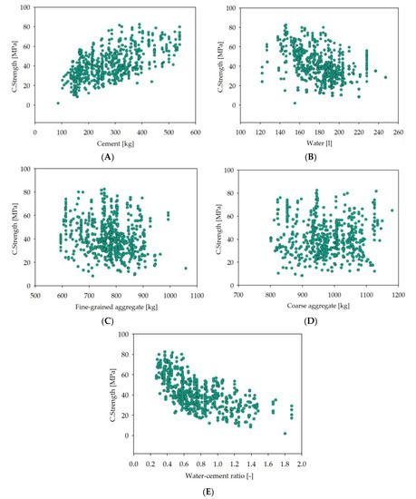 The scatter plots of target variable vs. input variables. The full compressive strength of concrete is on the vertical axis, expressed in MPa. The horizontal axis is the material content, expressed in kg for cement, fine-grained aggregate, and coarse-grained aggregate and L for water: (A) cement; (B) water; (C) fine-grained aggregate (sand 0–2 mm); (D) coarse-grained aggregate (aggregate above 2 mm); (E) water–cement ratio.