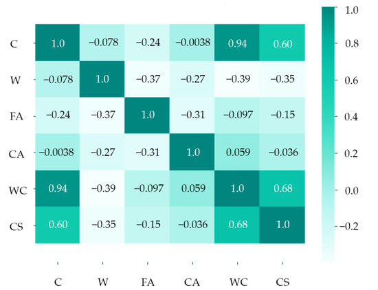 where is a medium concrete compressive strength, expressed in MPa, and , are coefficients that depend on the type and strength class of the aggregate and the strength class of the cement. The coefficient is taken when C/W < 2.5 and is taken when C / W > 2.5. represents the weight of cement in 1 m3 of concrete, expressed in kg, represents the amount of water in 1 m3 of concrete, expressed in L; is the amount of air in 1 m3 of concrete, expressed in dm3, and is a numerical value depending on the quality of cement and aggregate, and it can be taken as a constant equal to 0.5. The value is positive when the water–cement ratio is greater than or equal to 2.5 and negative when the water–cement ratio is less than 2.5. The Feret equation is valid when the aggregate strength is lower than the grout strength and applies to porous concrete. Lastly, Equation (4) is called the water-tightness equation, which tells us that the volume sum of the individual components is equal to the entire concrete mix volume.