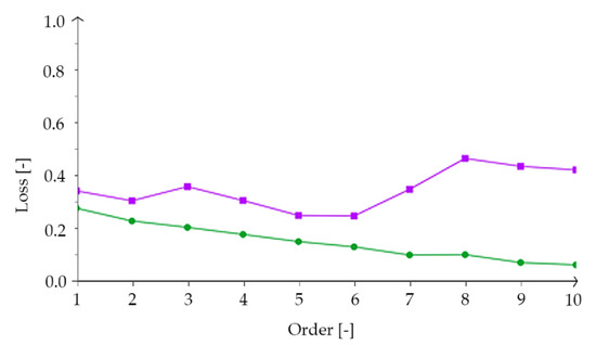 The dataset had many input variables. Principal component analysis (PCA) was used to keep critical information while reducing input variables in a smaller feature space. Thanks to this method, among other things, it was possible to reduce the data dimensionality by feature extraction. The PCA uses auxiliary variables to explain most of the variability in the dataset [58,59,60,61,62]. One of the critical aspects when building an optimal DNN model is implementing the order selection algorithm. These algorithms help to minimize the loss of acquired data and find the most suitable DNN model with an optimal number of neurons which will match the data. In this study, an incremental order algorithm [63,64,65,66,67,68] was used. Figure 4 shows the training and selection loss history for various subsets from the incremental order algorithm performance within 10 iterations.