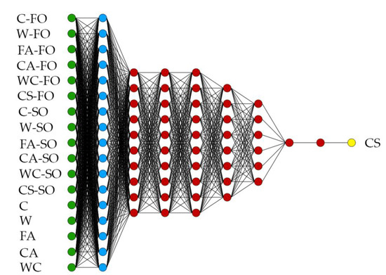 Final architecture of deep neural network (DNN) that was used. The figure shows the DNN architecture, which includes principal components (blue), perceptron neurons (red), and scaling and unscaling layers. The scaling neurons are green, and unscaling neurons are yellow. Abbreviations: C—cement; W—water; FA—fine-grained aggregate; CA—coarse-grained aggregate; WC—water–cement ratio; CS—the full concrete compressive strength; FO—first observation; SO—second observation.