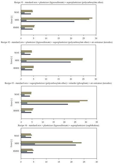 Gradings and fitting curves for each designed concrete recipe are presented in Appendix B. The comparative analysis of errors is shown in Figure 6.