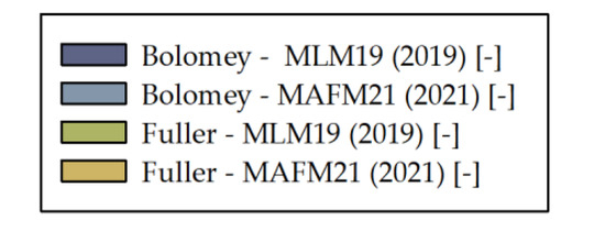 The comparative analysis was prepared, which included a comparison of the MAFM21 algorithm with the MLM19 algorithm from 2019 presented in [16], which was trained on the same dataset but was built using a different model. Four concrete mix recipes were tested, designed according to the Bolomey and Fuller design methods, which are standard concrete mix design approaches. The first recipe was a standard mix consisting of cement, water, and fine-grained and coarse-grained aggregate with a plasticizer (lignosulfonate) and superplasticizer (polycarboxylate ether). The second recipe was a standard mix with plasticizer (lignosulfonate), superplasticizer (polycarboxylate ether), and air entrainer (tensides). The third was a standard mix with superplasticizer (polycarboxylate ether), retarder (phosphate), and air entrainer (tensides). The fourth was a standard mix with plasticizer (lignosulfonate) and superplasticizer (naphthalene). The recipes were prepared for 1 m3 of concrete designed as a concrete slab, with a plastic slump (which gives a lower value than the usual water–cement ratio), direct pouring with little environmental aggression, no special desired finishing, no special ambient conditions when casting, air content at 2.5%, and 20 mm maximum grain diameter. The following materials were adopted for the design: network water, ordinary Portland cement, natural sand, limestone gravel 4/10 mm, and limestone gravel 10/20 mm. Combinations of admixtures commonly used in engineering practice were selected. The exact composition of the designed mixtures is presented in Table 3 (Bolomey method) and Table 4 (Fuller method). Two similar recipes designed for a given compressive strength were used as observations to calculate the concrete compressive strength using the MAFM21 algorithm.