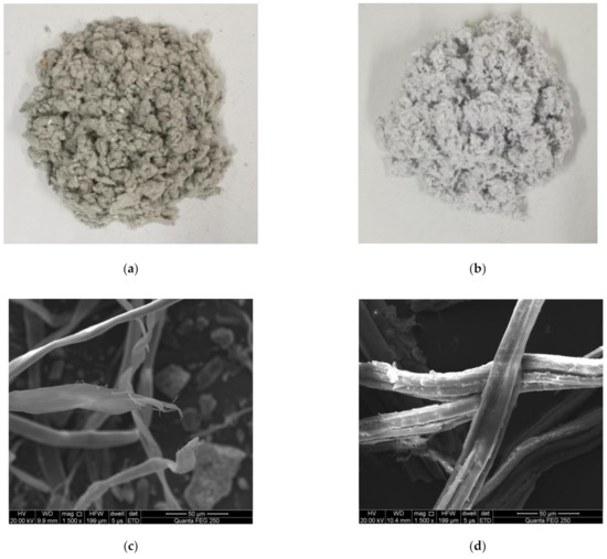 The lignin fiber was a flocculent fiber provided by Galway Technology Co., Ltd. (Sichuan, China), whereas the bamboo fiber was a flocculent fiber (Homemade, Changsha, Hunan, China) fabricated in laboratory. The subtle differences between the two fibers can be observed from their digital photos (Figure 1a,b) as well as from their scanning electron microscope (SEM, Quanta, Houston, TX, USA) micrographs (Figure 1c,d). The SEM micrographs reveal that lignin fibers (with typical lengths of 4 to 10 mm) have smooth surfaces and relatively uniform diameters across single fibers (typically 10 to 20 µm) and they interweave with prominent branches at the ends, which cause lap bonding and enhance the adhesion between asphalt and aggregate. In contrast, bamboo fibers (with typical lengths of 4 to 8 mm) have diameters that are more diverse across single fibers (typically 15 to 20 µm) and feature the presence of gullies on the fiber surface.