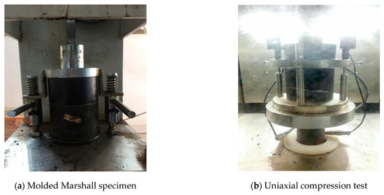 The compressive strength and compressive resilient modulus of asphalt mixture before and after ageing at 20 °C were tested to evaluate its mechanical properties. A cylindrical specimen of φ100 mm × 100 mm was formed by static pressure method (Static pressure forming instrument, Taiding, Cangzhou, Hebei, China). MTS-810 universal material testing machine (MTS, Eden Prairie, MN, USA) was used for the test and the loading rate was 2 mm/min.