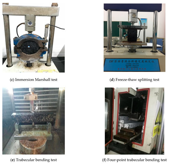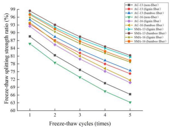 The moisture stability of asphalt mixture before and after ageing was evaluated by immersion Marshall test (Marshall compactor, Tuoxing, Nanjing, Jiangsu, China) and freeze-thaw splitting test (Splitting tester, Zhulong, Cangzhou, Hebei, China); the immersion Marshall residual stability and freeze-thaw splitting strength of fiber asphalt mixture were tested, respectively. Freeze-thaw cycle durability was evaluated by a freeze-thaw splitting test under different freeze-thaw cycles. The conditions of a single freeze-thaw cycle were as follows: the sample was frozen at −18 °C for 16 h and then placed in a thermostatic water tank (Jiangnan, Ningbo, Zhejiang, China) at 60 °C for 24 h. Each sample was freeze-thawed 1, 2, 3, 4 and 5 times, respectively. All freeze-thaw cycle samples were put in a constant temperature water tank at 25 °C for 2 h, and then the splitting tensile strength was measured by an SYD-0731 uniaxial compression testing machine (Meiyu, Shanghai, China), and the splitting tensile strength ratio was calculated.