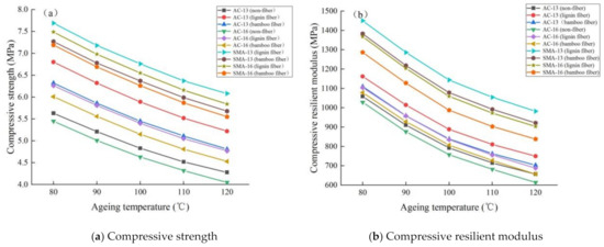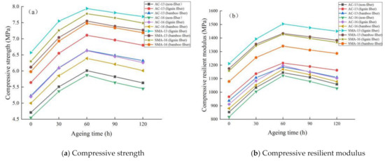 (1) with the increase in ageing temperature, the compressive resilient modulus and compressive strength of fiber asphalt mixture show a decreasing trend, which indicates that the increase in ageing temperature can reduce the mechanical properties of asphalt mixture. This is because the higher the ageing temperature, the more easily polar molecules in asphalt react with oxygen. Meanwhile, the viscosity of asphalt decreases, the resistance of intermolecular binding weakens, and the adhesion between asphalt and aggregates weakens. Therefore, the mechanical properties of asphalt mixture decrease at higher ageing temperatures [30].