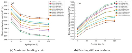 (1) with the extension of ageing time, the maximum bending strain of fiber asphalt mixture decreases, while the bending stiffness modulus increases. In the ageing process, asphalt undergoes oxidation, volatilization and polymerization, resulting in the decrease in light components and the increase in heavy components [26]; the asphalt binder becomes brittle and hard, and its antideformation ability decreases. As a result, the bending stiffness modulus of asphalt mixture increases, the bending strain decreases, and as it is easy to fracture at low temperatures, the low-temperature crack resistance becomes worse.