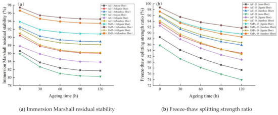The results of moisture stability test of fiber asphalt mixture under different ageing times are shown in Figure 6.