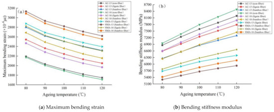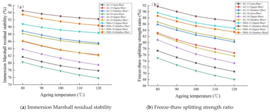 The test results demonstrating mechanical properties of fiber asphalt mixture at different ageing temperatures are shown in Figure 7.